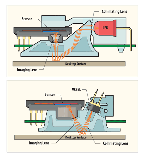 - ماوس های اپتیکال نور LED دارند، در مقابل ماوس های لیزری از مادون قرمز استفاده می کنند.